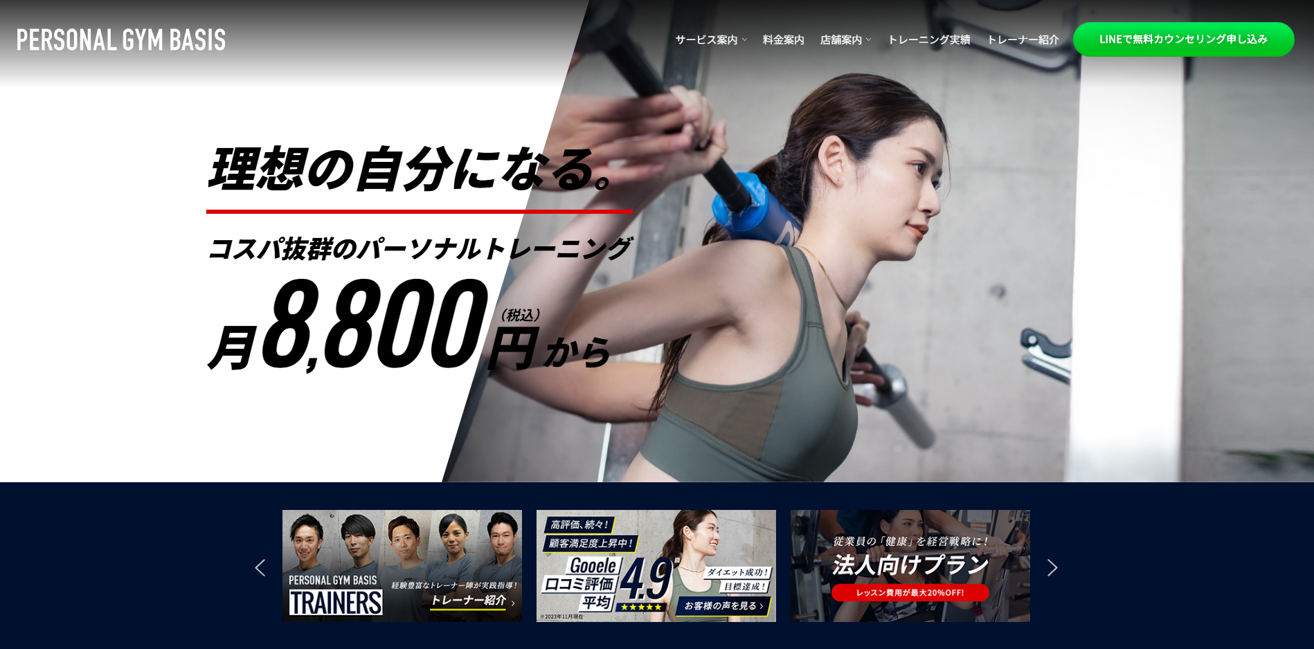 パーソナルジムBASISは、東京都内(渋谷・神田・上野など)に展開する、業界最安級のパーソナルトレーニングジムです。月額8,800円から始められ、短期集中型ではなく、健康的で持続可能な体づくりを重視しています。
